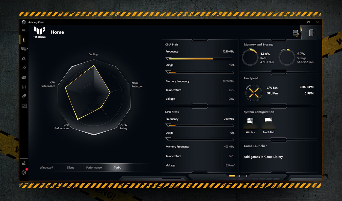 Armoury Crate w jednym miejscu oferuje zarówno sterowanie pracą systemu, jak i oświetleniem, dzięki czemu najważniejsze opcje masz zawsze pod ręką w jednej aplikacji narzędziowej. Korzystając z bogatych opcji personalizacji tej aplikacji, możesz dostosować efekty i wygląd, idealnie dopasować profile gamingowe, a także dokonać ustawień dźwięku, aby wszystko było zgodne z Twoimi preferencjami. Funkcja profili scenariuszy pozwala Ci zdefiniować i dostosować preferowane schematy, które automatycznie dopasują wydajność i inne ustawienia podczas uruchamiania swoich ulubionych aplikacji i gier. Obejmij całkowitą kontrolę nad swoimi wrażeniami i perfekcyjnie dopasuj je do swojego stylu.