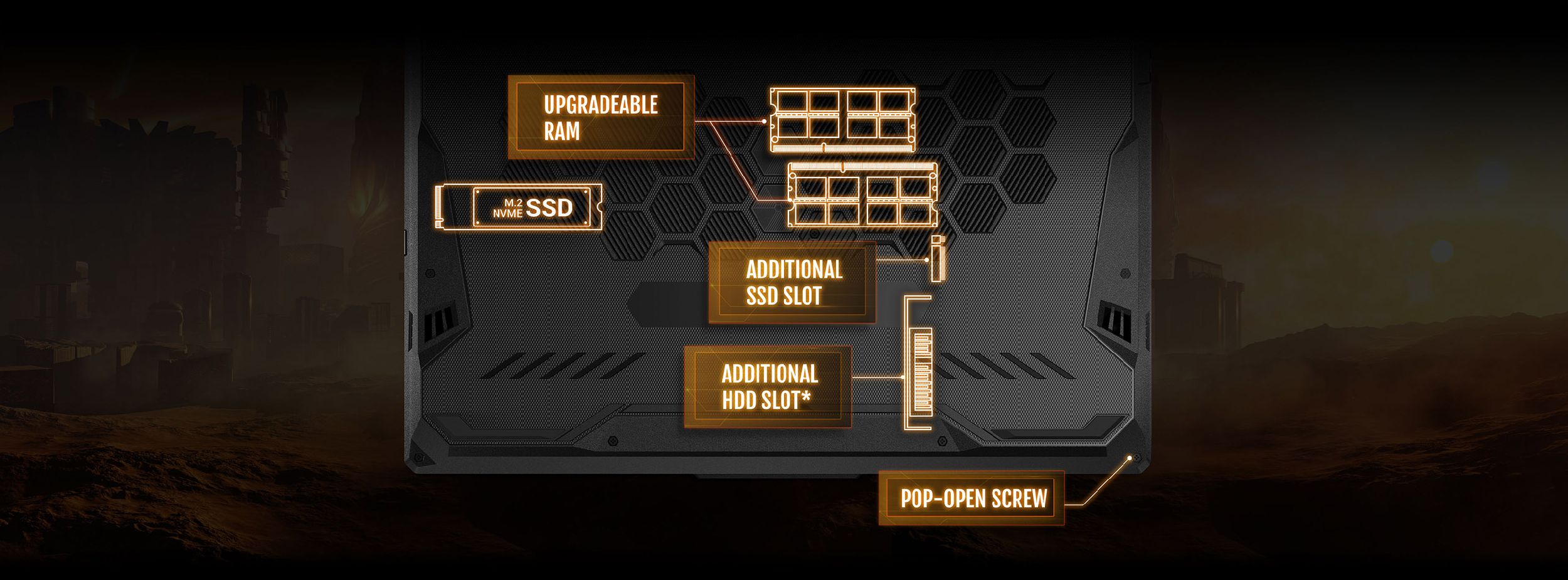 Uzbrojony do bitwy laptop TUF Gaming F17 jest wyposażony w maksymalnie procesor Intel® Core™ i7 10. generacji z 6 rdzeniami i 12 wątkami, dzięki czemu z łatwością poradzi sobie z poważną rozgrywką, strumieniowaniem i zadaniami mocno obciążającymi system. W maksymalnej konfiguracji procesor pracuje w parze z niezależną kartą graficzną GeForce® GTX 1650 Ti, co przekłada się na stale wysokie wartości FPS w szerokiej gamie gier. Przyspieszysz również czasy ładowania gier z Twojej ogromnej kolekcji, mając do dyspozycji dysk SSD NVMe PCIe® o maks. pojemności 1 TB oraz dodatkowe gniazdo na drugi dysk SSD.