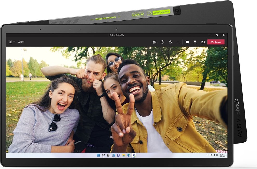 Jedna kamera: standardowo. Dwie kamery: Vivobook 13 Slate OLED! Te dwie kamery – 5 MP z przodu i 13 MP z tyłu – umożliwiają wyraźne rozmowy wideo i czatowanie, czy to podczas pracy, czy też rozrywki. Możesz również błyskawicznie wykonywać zdjęcia selfie przy pomocy kamery przedniej, natomiast kamerą tylną wykonasz zdjęcia o wysokiej rozdzielczości.