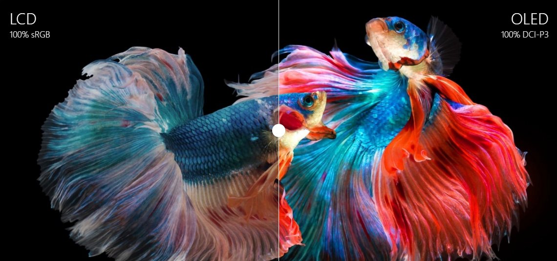 Laptopy ASUS OLED utrzymują 100% pokrycie przestrzeni barw DCI-P3 zarówno przy wysokim, jak i niskim poziomie jasności, podczas gdy w standardowym laptopie z ekranem LCD paleta kolorów jest znacznie redukowana przy niskiej jasności. Przy jasności zbliżonej do szarości na poziomie 16 G laptopy z ekranami LCD oferują tylko 11% pokrycie przestrzeni barw DCI-P3, natomiast laptopy z ekranami ASUS OLED utrzymują 100% DCI-P3.