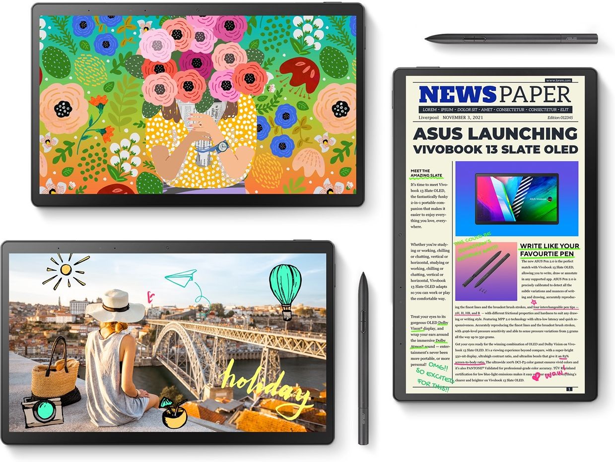 Prezentujemy Vivobook 13 Slate OLED – fantastyczny, oferujący niesamowitą przyjemność z użytkowania laptop typu 2 w 1, dzięki któremu możesz w każdym miejscu cieszyć się tym, co uwielbiasz. Niezależnie od tego, czy uczysz się, pracujesz, relaksujesz się lub czatujesz – w orientacji poziomej lub pionowej – Vivobook 13 Slate OLED dostosowuje się do wykonywanego zadania, dlatego zawsze możesz pracować lub korzystać z treści rozrywkowych w wybrany przez siebie sposób! Nowy ASUS Pen 2.0 zapewni Ci całkiem nowy sposób pisania i rysowania, oferując wymienialną, teksturowaną końcówkę. Oszałamiające wrażenia wizualne gwarantuje Ci wyświetlający przepiękny obraz ekran OLED Dolby Vision®, a immersyjny dźwięk jest zapewniony dzięki technologii Dolby Atmos® – rozrywka nigdy jeszcze nie była bardziej mobilna i bardziej spersonalizowana!