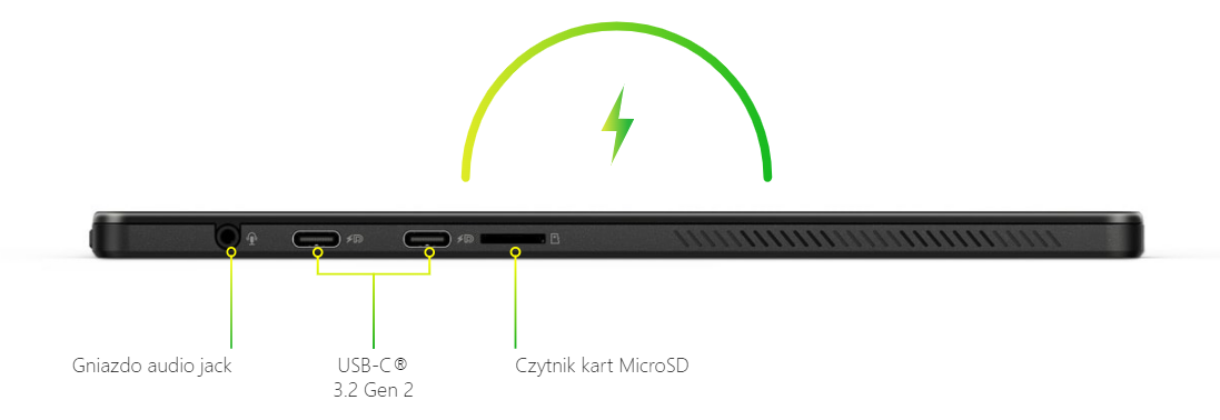 Z laptopem Vivobook 13 Slate OLED nigdy nie zabraknie Ci portów do podłączania wszystkich swoich gadżetów. Oferuje dwa w pełni funkcjonalne porty USB-C® z funkcją Power Delivery, a także DisplayPort, czytnik kart MicroSD i gniazdo dźwiękowe typu jack. Kiedy przyjdzie czas na wieczorną rozrywkę z przyjaciółmi, możesz zamienić go w optymalne urządzenie do wrażeń kinowych, podłączając zewnętrzny monitor lub telewizor wielkoekranowy!