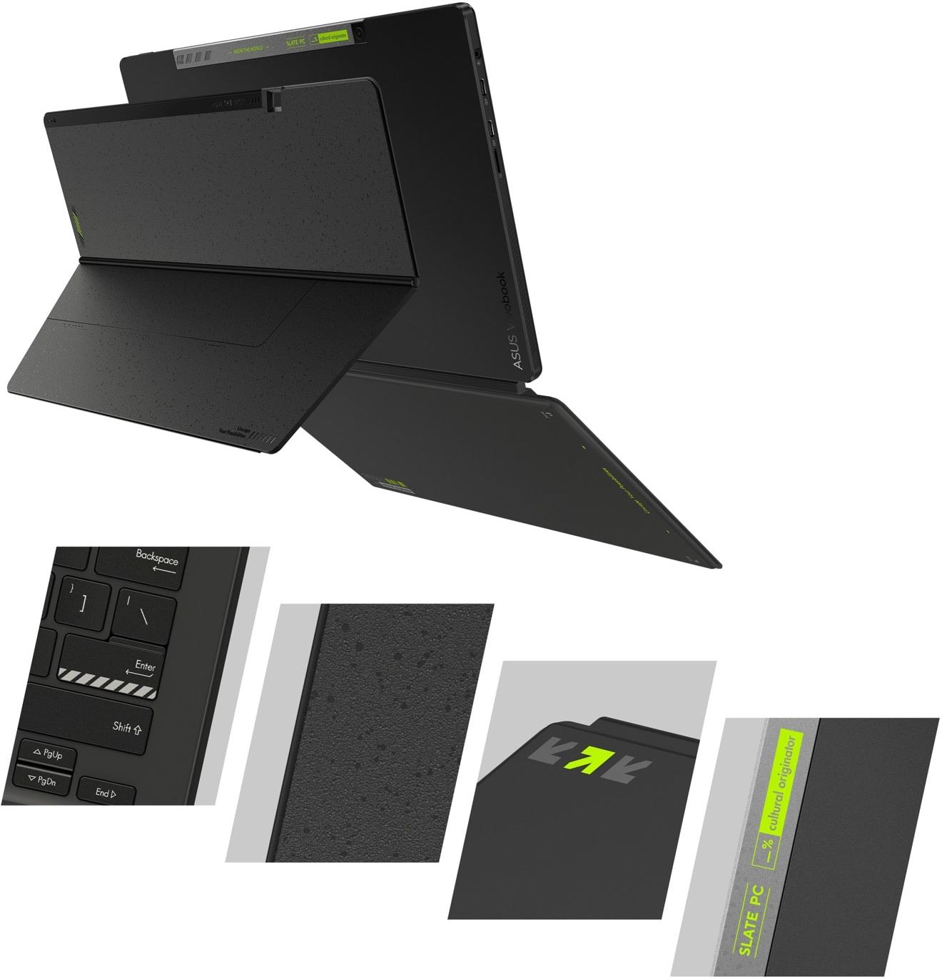 Vivobook 13 Slate OLED przykuwa uwagę stylem pełnym charakteru! Dzięki wyjątkowej pokrywie z funkcją stojaka z wykończeniem ze stylizowanymi „rozbryzgami” i atrakcyjnym detalom zielonym, laptop ten od góry do dołu emanuje radosnym stylem.