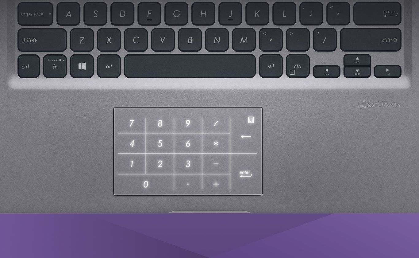 Nowy ASUS NumberPad znacznie ułatwia pracę, gdy nadchodzi czas na łamanie liczb: wystarczy dotknąć ikony touchpada, aby zmienić touchpad w podświetlaną diodami LED klawiaturę numeryczną.