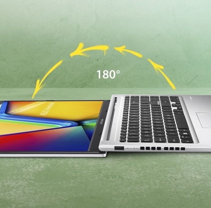 Umożliwiający ułożenie laptopa na płasko zawias umożliwiający obrót o 180° znacznie ułatwia wspólne oglądanie treści z innymi osobami. Opcjonalne podświetlenie klawiatury w laptopie Vivobook 15 jest idealne do pracy przy słabym oświetleniu.