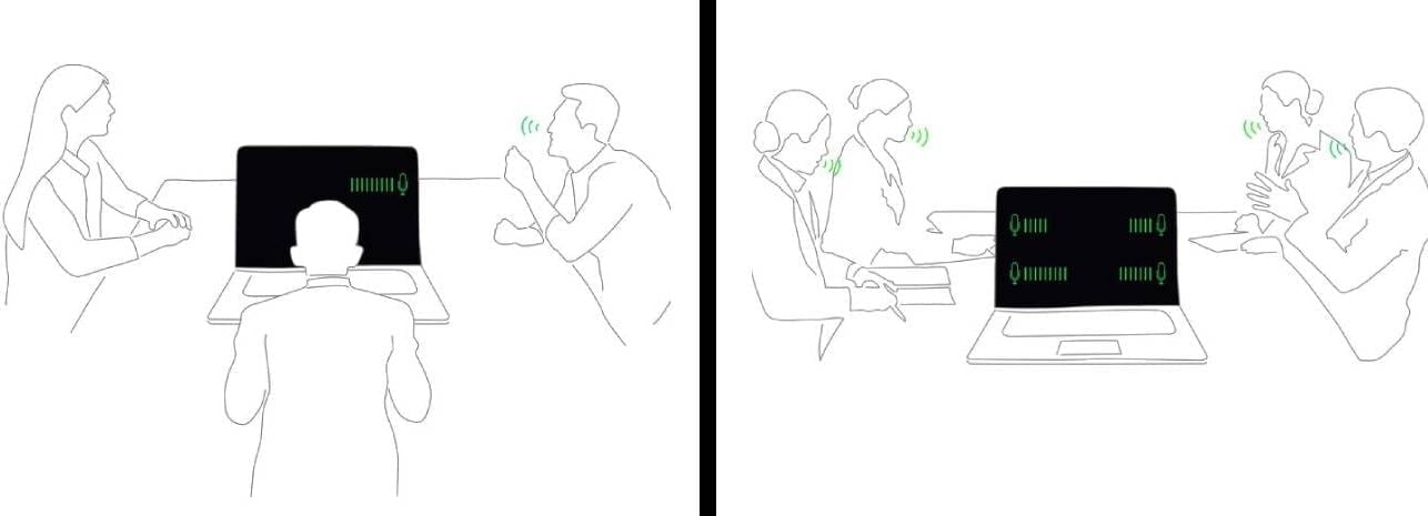 Tryb połączenia konferencyjnego z wieloma prezenterami filtruje hałasy z otoczenia, jednocześnie wykrywając wiele głosów ze wszystkich kierunków i odległości, dzięki czemu głosy wszystkich osób są lepiej słyszane.