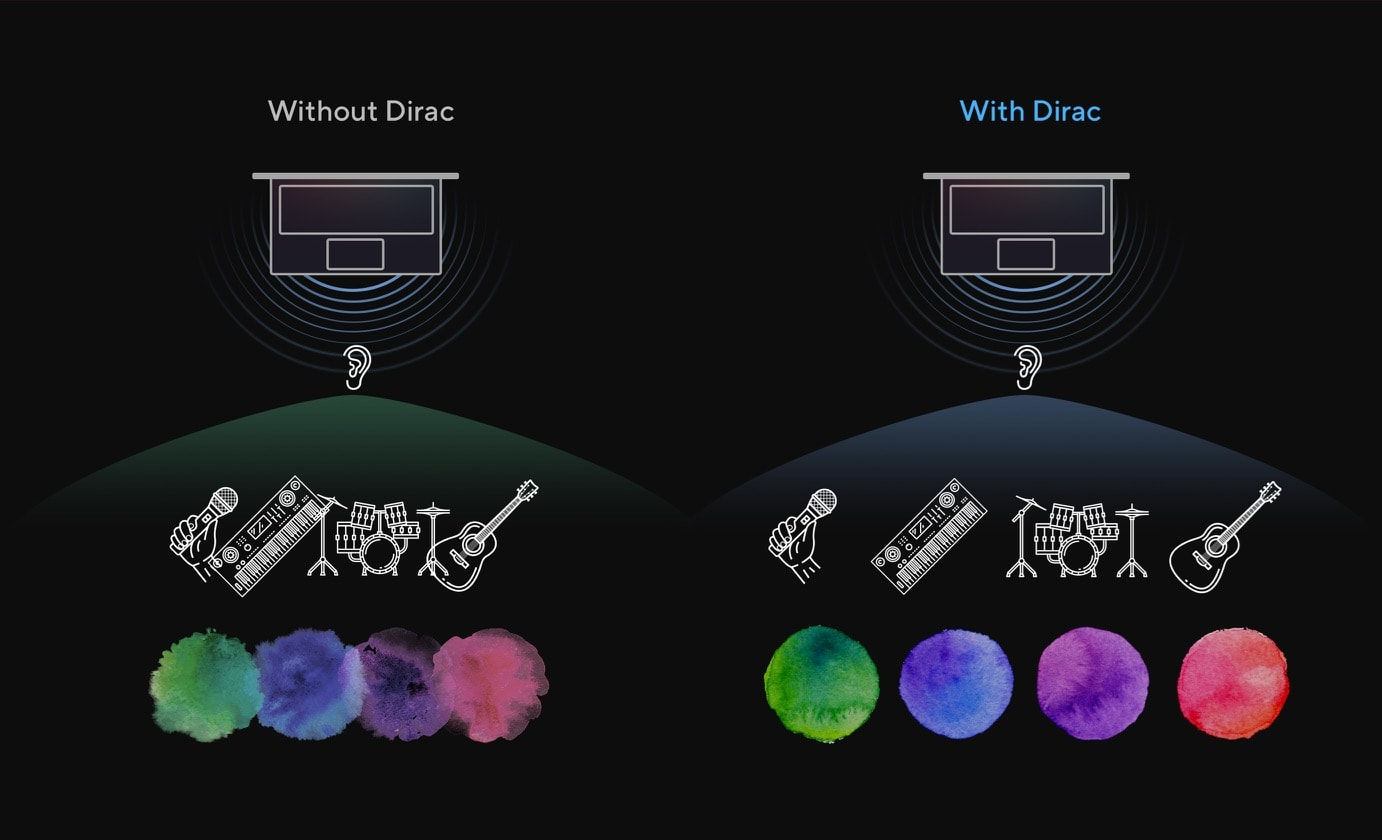 System audio, zaprojektowany we współpracy z ekspertami z firmy Dirac, dostarcza czyste, zbalansowane i wciągające brzmienie. Doświadcz szerszej sceny dźwiękowej, która uwalnia pełen potencjał audio Twojego laptopa podczas oglądania filmów, słuchania muzyki i w trakcie wideokonferencji.
