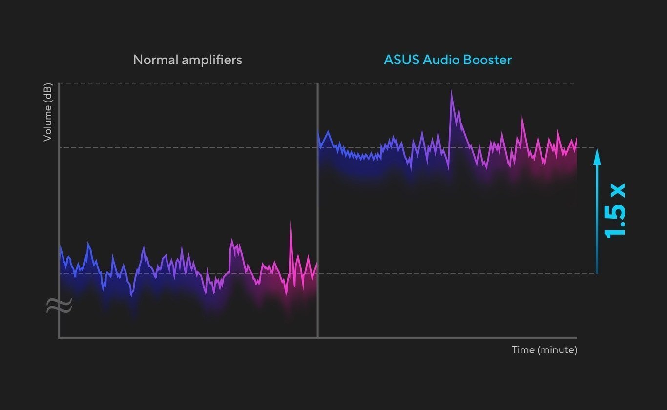 Technologia ASUS Audio Booster wykorzystuje wyjątkowe algorytmy audio, zwiększając głośność dźwięku nawet 1,5-krotnie i zapewniając wrażenia dźwiękowe na wyższym poziomie.