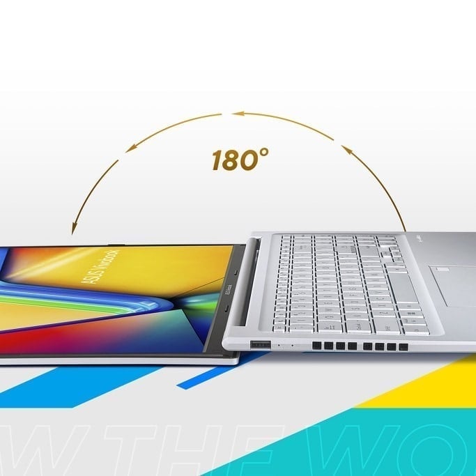 Vivobook 16 jest wyposażony w precyzyjnie zaprojektowany zawias pozwalający na ułożenie otwartego urządzenia na płasko, który ułatwia udostępnianie treści innym osobom lub pracę grupową przy stole.