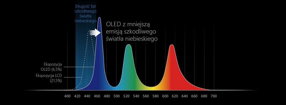 Ponieważ oczy dzieci nie są jeszcze w pełni rozwinięte i mają bardziej przezroczystą soczewkę i rogówkę, szkodliwe światło niebieskie może łatwiej przenikać oko, co z kolei może doprowadzić do przedwczesnego starzenia się siatkówki. Badania wykazały, że w oczach pięcioletniego dziecka około 60% odbieranej emisji światła niebieskiego przechodzi przez siatkówkę. Dla porównania, w przypadku 60-letniej osoby dorosłej jest to tylko około 20%. Dzięki znacznie niższym poziomom emisji światła niebieskiego ekrany ASUS OLED są bardziej przyjazne dla oczu dzieci.