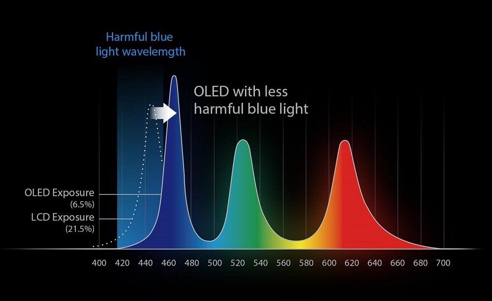 Powszechnie wiadomo, że światło niebieskie powoduje dyskomfort oczu i zaburzenia snu. Ze względu na właściwości specjalnych organicznych materiałów emitujących światło stosowanych w matrycach OLED, ekrany laptopów ASUS OLED emitują o 70% mniej szkodliwego światła niebieskiego. Co jeszcze ważniejsze, w przeciwieństwie do tradycyjnych filtrów światła niebieskiego, przesunięcie widma emisji pozwoliło uniknąć kompromisów w zakresie precyzji wyświetlania kolorów.