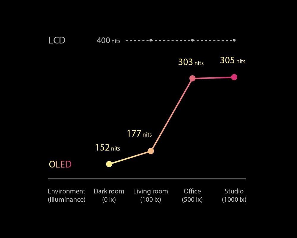 Laptopy ASUS OLED utrzymują dobre odwzorowanie kolorów przy każdym poziomie jasności, dlatego możesz swobodnie dostosować jasność ekranu do swojego środowiska pracy, a przy tym zawsze cieszyć się wyjątkowo żywymi kolorami. Dla przykładu w salonie (z reguły z oświetleniem o mocy około 100 luksów) ekran OLED potrzebuje tylko 177 nitów jasności, aby wyświetlić taki sam wyraźny obraz, co laptop z matrycą LCD przy jasności 400 nitów. Dzięki temu, że wyświetlacze OLED nie potrzebują dużej jasności, emitują one mniej szkodliwego światła niebieskiego.