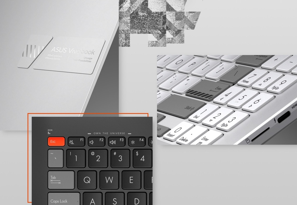 Wyjątkowe logo ASUS zwiększa uczucie ekscytacji przed otwarciem pokrywy. Odkryj więcej i zobacz, jak przykuwający uwagę styl został zastosowany również pod pokrywą, gdzie centralne miejsce zajmuje klawisz Enter z ostrzegawczymi paskami. Kontynuacją wzornictwa przemysłowego jest również przycisk ESC wykonany w stylu „color-blocking” w ostrzegawczym kolorze pomarańczowym, który odzwierciedla pionierskiego ducha Twojego nowego, wspaniałego świata. Przeprojektowana klawiatura przypomina z wyglądu profesjonalny pulpit studyjny lub klawiaturę mechaniczną, zachęcając Cię do odkrywania nowych możliwości.
