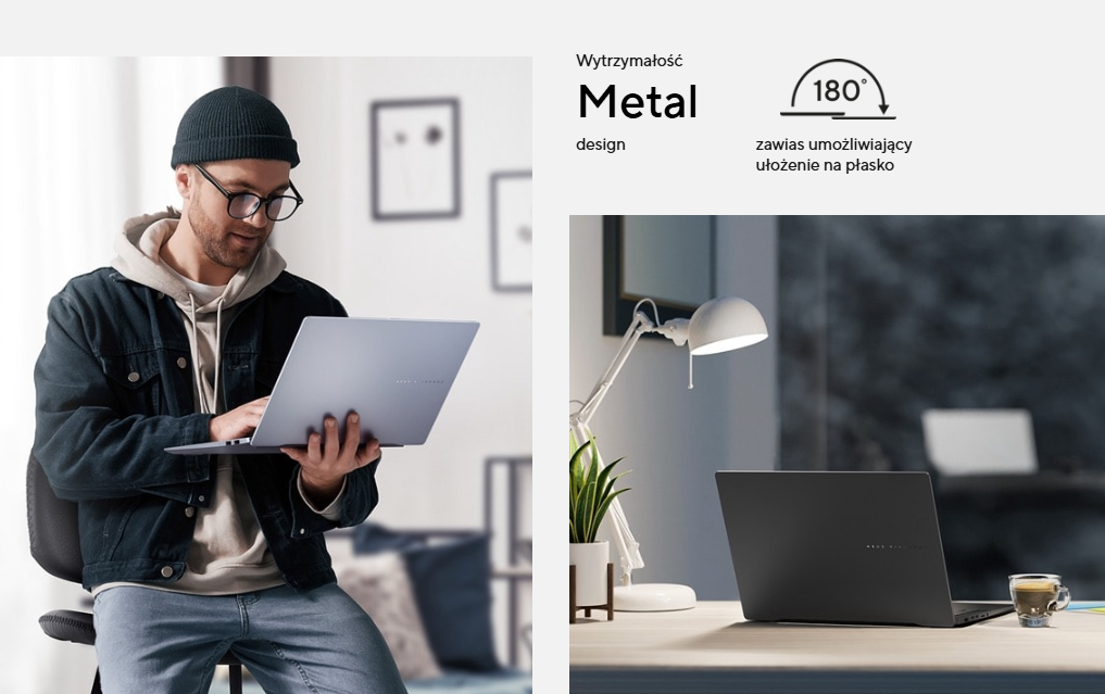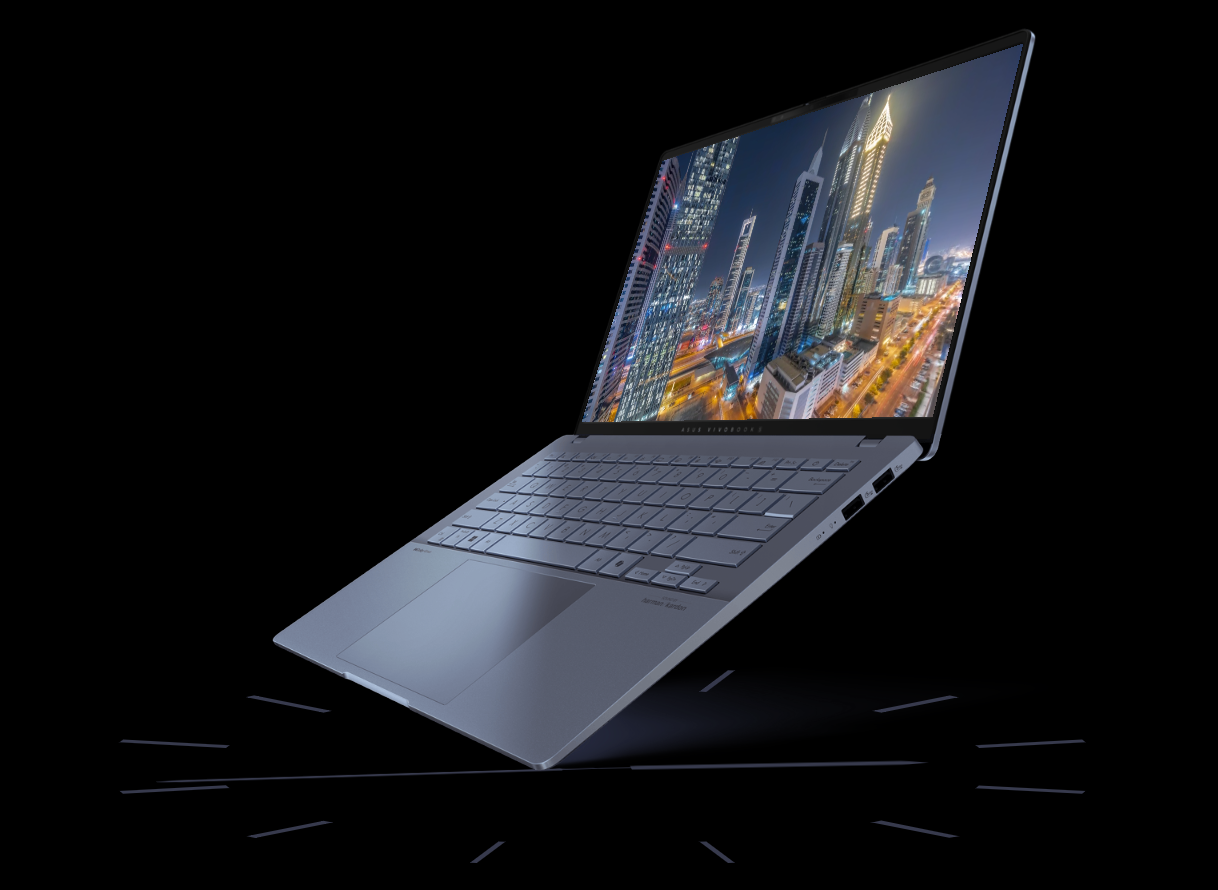 ASUS Vivobook S 14 odzwierciedla Twój doskonały gust. Elegancki i minimalistyczny design wraz z wyrafinowanym logo wygrawerowanym w procesie obróbki CNC sprawia, że urządzenie emanuje prostym, a zarazem wyrafinowanym stylem. Urządzenie jest dostępne w dwóch nowoczesnych kolorach wykończenia: Neutral Black lub Mist Blue. Jego wszechstronna, zwężana konstrukcja wykonana z jednego kawałka materiału zapewnia lepszą ogólną solidność i stabilność laptopa.