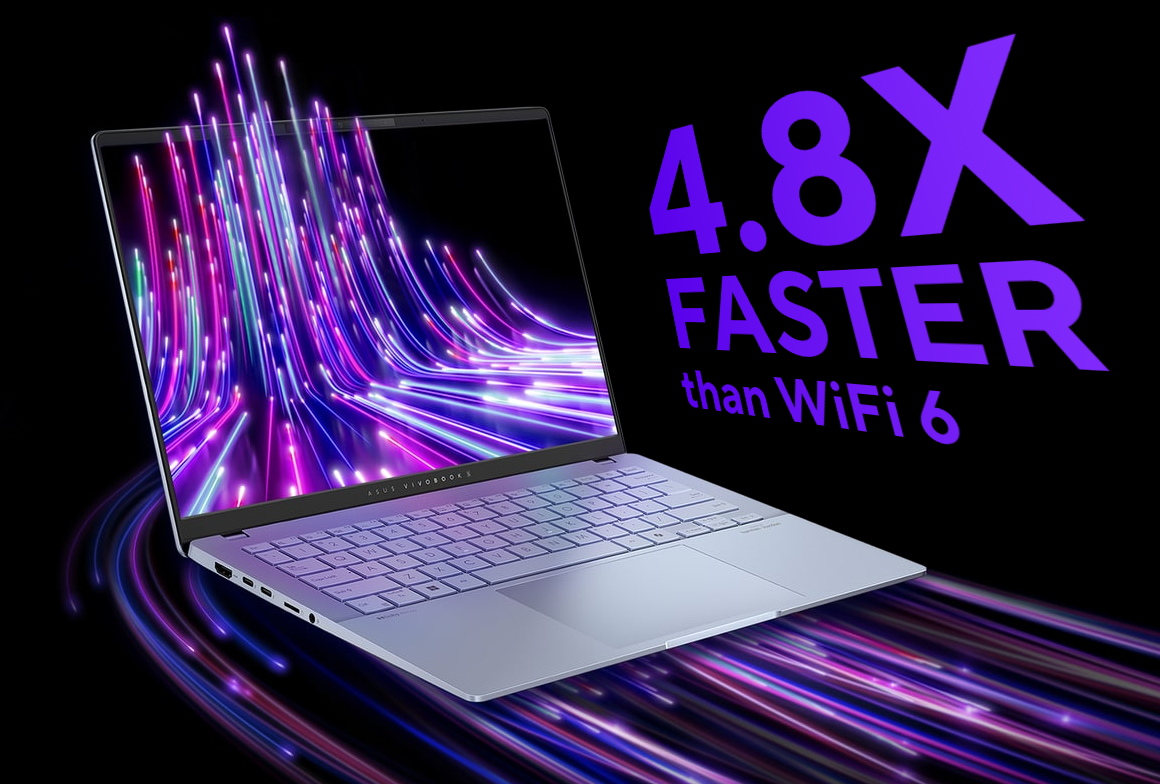 ASUS Vivobook S 14 ma na pokładzie najnowsze technologie Wi-Fi 7 dla najlepszego połączenia bezprzewodowego – aż do 4,8 razy szybszego, niż poprzednia generacja Wi-Fi. Twój laptop automatycznie wybiera najmocniejszy sygnał Wi-Fi i wydajnie używa całego dostępnego mu pasma. Ze wsparciem dla trzech jednoczesnych połączeń z słuchawkami Bluetooth, doświadczysz też lepszej komunikacji oraz bardziej wciągającej rozrywki.