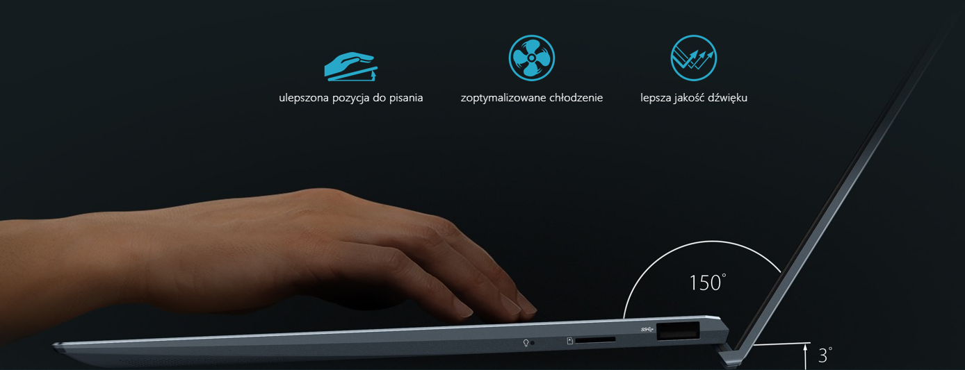 ZenBook 13 OLED posiada precyzyjnie zaprojektowany zawias ErgoLift, który po otwarciu pokrywy automatycznie lekko unosi tylną część laptopa, zapewniając optymalny kąt ustawienia klawiatury do wygodnego pisania. Czynność ta dodatkowo podnosi obudowę dla zapewnienia zoptymalizowanego chłodzenia i lepszej jakości dźwięku.