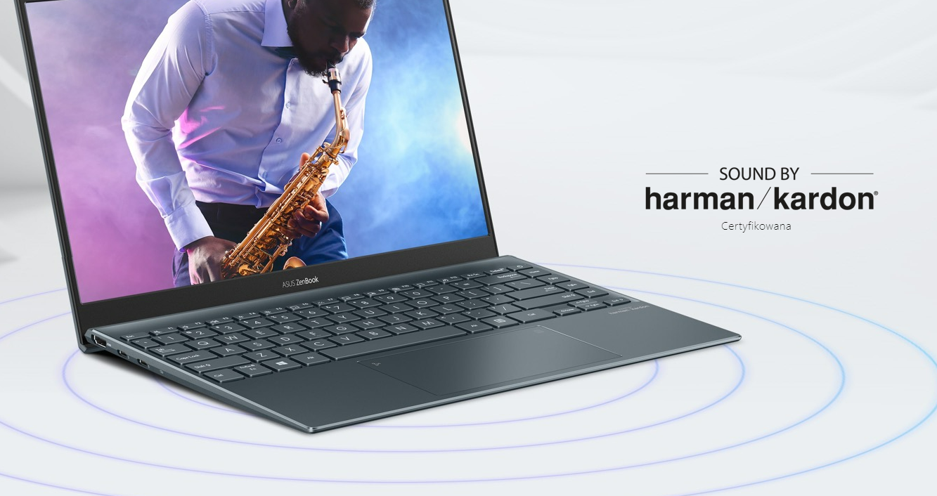 System audio laptopa ZenBook 13 OLED jest certyfikowany przez specjalistów z firmy Harman Kardon dla zagwarantowania immersyjnego, kryształowo czystego dźwięku w komunikacji głosowej lub rozrywce.