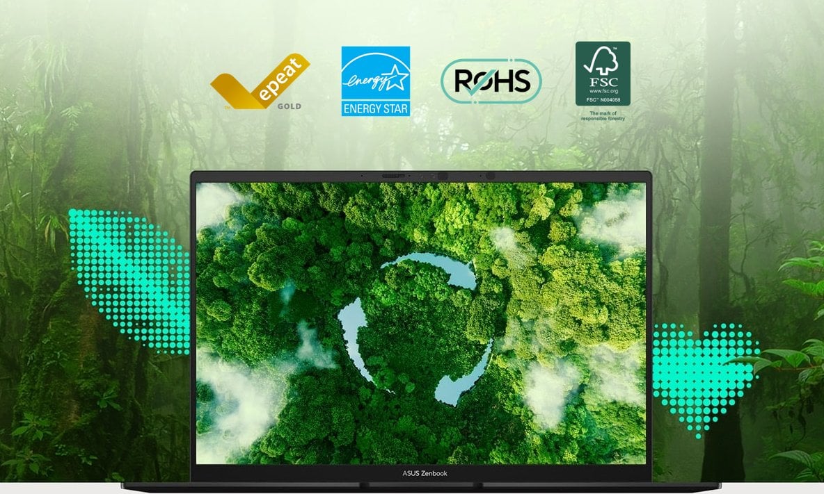 Firma ASUS angażuje się dla postępu technologicznego w kierunku przyszłości zgodnej z zasadami zrównoważonego rozwoju. Zenbook 14 OLED jest wykonany z ekologicznych materiałów – zarówno samo urządzenie, jak i jego opakowanie. Czołowe ekologiczne znaki jakości i dopuszczenia, w tym certyfikaty EPEAT Gold, ENERGY STAR® i RoHS, potwierdzają nasze zaangażowanie w ochronę planety Ziemi. Zarazem świadczą o tym, że zawsze zapewniamy najlepsze możliwe rozwiązania dla naszych klientów.