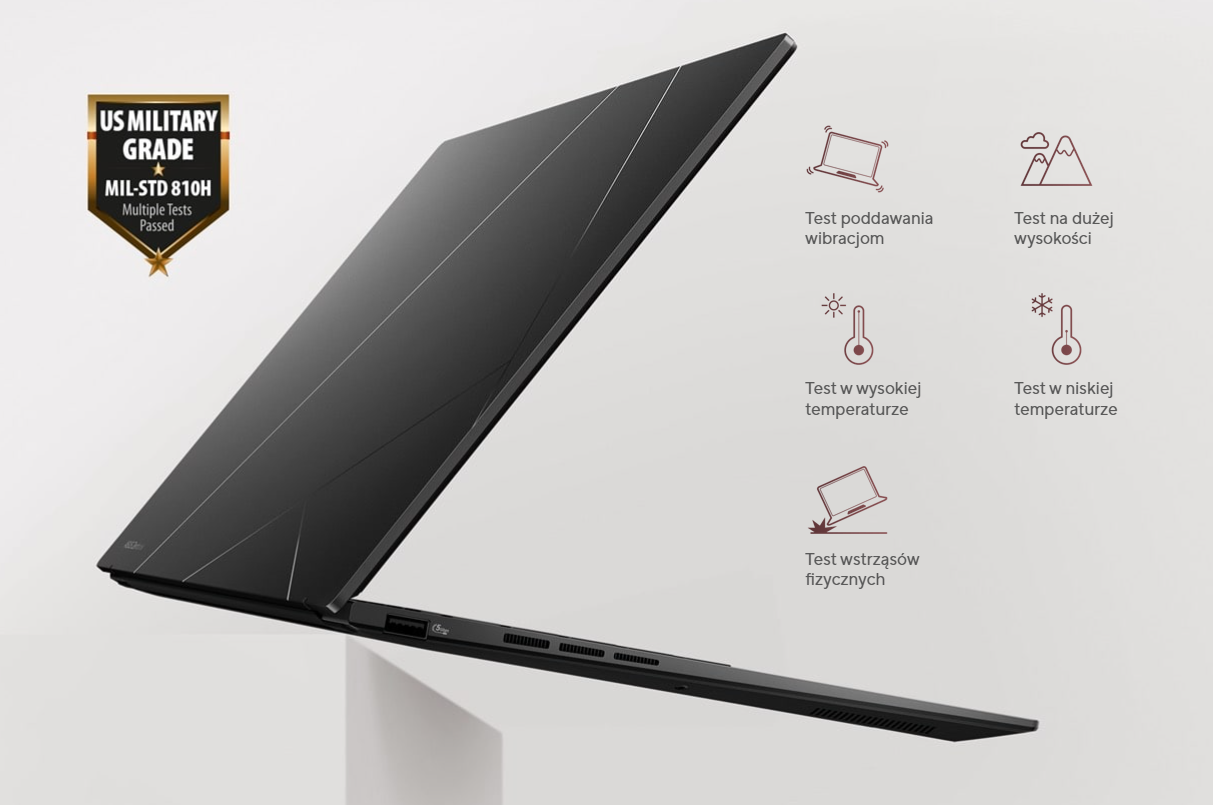 Laptopy ASUS klasy konsumenckiej spełniają niesamowicie wymagające kryteria wojskowego standardu MIL-STD 810H, który służy do oceny niezawodności i wytrzymałość sprzętu. Laptop ten przechodzi rygorystyczne testy, np. test funkcjonowania w trudnych warunkach otoczenia. Czynniki te pomagają zwiększyć żywotność laptopa, dzięki czemu możesz pracować, podróżować i cieszyć się rozrywką, mając pewność, że Twój laptop ASUS jest gotowy na różne scenariusze zastosowań – nie tylko teraz, ale również i długo w przyszłości.