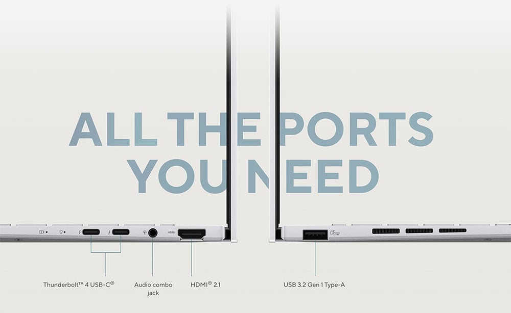 Zenbook 14 OLED zawiera wszystkie niezbędne i gwarantujące pełną funkcjonalność porty, których potrzebujesz, aby cieszyć się szybkimi i niezawodnymi połączeniami w podróży. Dzięki temu unikniesz niewygodnego noszenia ze sobą adapterów. Dostępne jest nawet wygodne gniazdo audio typu combo!