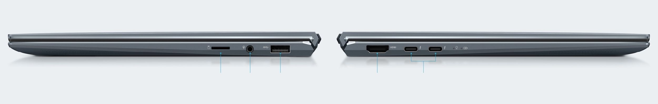 ZenBook 14 oferuje pełen zestaw gniazd wejścia/wyjścia, w tym pełnowymiarowe złącza HDMI i USB Type-A. Masz również do dyspozycji moc złącza Thunderbolt™ 4, korzystając z dwóch gniazd USB-C®. Do wygodnych transferów danych z urządzeń mobilnych zintegrowano również czytnik kart microSD. Karta pracująca w standardzie Wi-Fi 6 (802.11ax) oferuje łączność bezprzewodową z prędkościami nawet 3x wyższymi niż przy zastosowaniu Wi-Fi 57. Zintegrowana technologia ASUS WiFi Master8 jeszcze bardziej udoskonala połączenia.