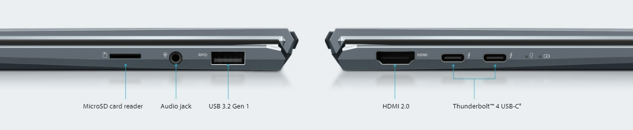 ZenBook 14 oferuje pełen zestaw gniazd wejścia/wyjścia, w tym pełnowymiarowe złącza HDMI i USB Type-A. Masz również do dyspozycji moc złącza Thunderbolt™ 4, korzystając z dwóch gniazd USB-C®. Do wygodnych transferów danych z urządzeń mobilnych zintegrowano również czytnik kart microSD. Karta pracująca w standardzie Wi-Fi 6 (802.11ax) oferuje łączność bezprzewodową z prędkościami nawet 3x wyższymi niż przy zastosowaniu Wi-Fi 5. Zintegrowana technologia ASUS WiFi Master jeszcze bardziej udoskonala połączenia.