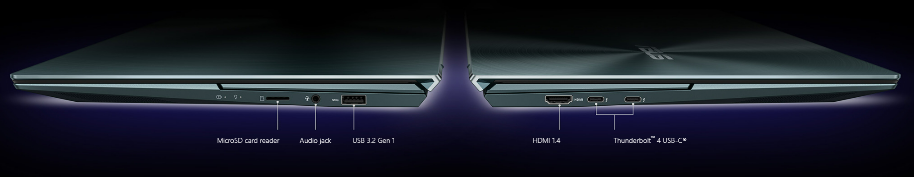 Do łatwego podłączania urządzeń peryferyjnych ZenBook Duo 14 został wyposażony w pakiet wysokowydajnych gniazd wejścia/wyjścia, w tym parę najnowszych portów Thunderbolt™ 4 USB-C®. Obsługują one technologie Power Delivery i DisplayPort, a ponadto zapewniają Ci przepustowość 40 Gb/s do podłączenia zewnętrznego monitora 8K lub dwóch monitorów 4K UHD. ZenBook Duo 14 dysponuje również kartą Wi-Fi 6 (802.11ax), wspomaganą technologią ASUS WiFi Master Premium, dzięki czemu możesz łatwo tworzyć treści i udostępniać je w drodze.