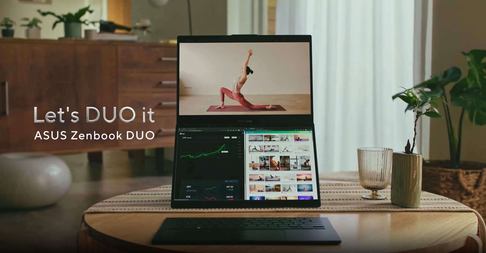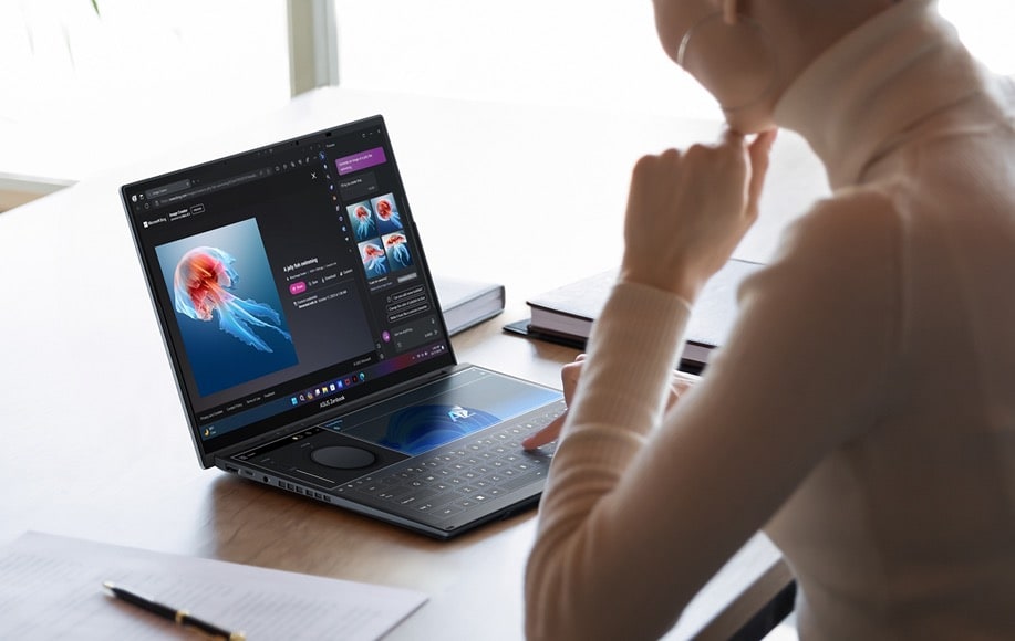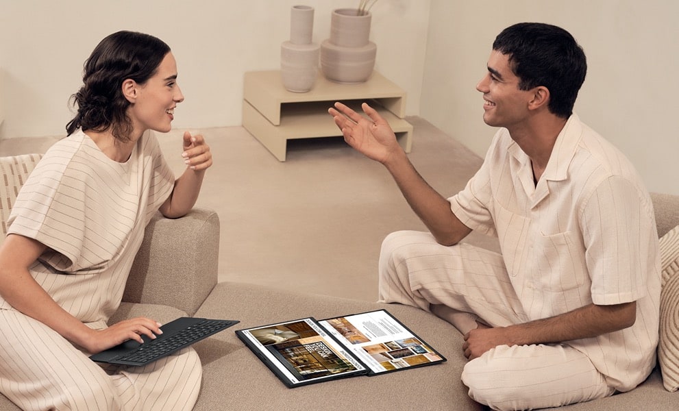 Unikalna konstrukcja z zawiasem 180 stopni oraz zintegrowaną podpórką pozwala na korzystanie z laptopa w pięciu różnych trybach. W trybie desktopowym ekrany ustawione są pionowo obok siebie, natomiast tryb dwóch ekranów z wirtualną klawiaturą pozwala zamienić dolny panel w panel sterowania lub klawiaturę. Tryb udostępniania umożliwia rozłożenie urządzenia na płasko, co ułatwia prezentowanie treści osobom siedzącym naprzeciwko. Klasyczny tryb laptopa pozwala natomiast na magnetyczne przymocowanie fizycznej klawiaturze do dolnego ekranu, tworząc zwartą bryłę idealną do podróży.