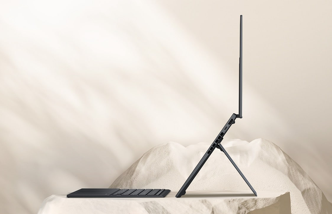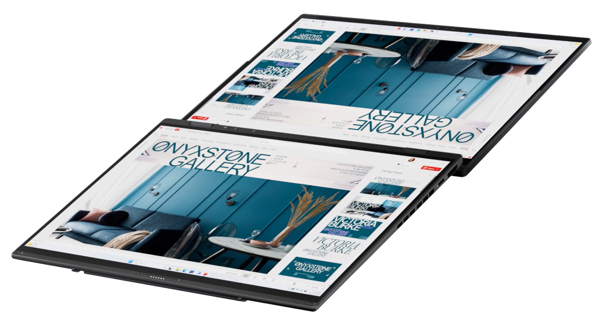 Urządzenie wyposażono w dwa 14-calowe ekrany dotykowe ASUS Lumina OLED o rozdzielczości 3K i częstotliwości odświeżania 120 Hz. Panele te oferują kinową jakość obrazu z jasnością do 500 nitów oraz stuprocentowym pokryciem palety barw DCI-P3, co gwarantuje profesjonalną wierność kolorów. Dzięki proporcjom 16:10 użytkownik zyskuje ogromną przestrzeń roboczą o przekątnej niemal 20 cali po rozłożeniu urządzenia. Ekrany chronione są przez wytrzymałe szkło Corning Gorilla Glass, a certyfikacja niskiej emisji światła niebieskiego dba o wzrok podczas wielogodzinnych sesji.