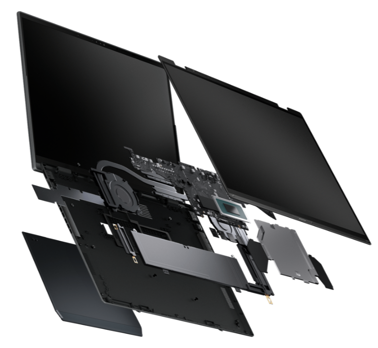 Laptop został wyposażony w akumulator o pojemności 75 Wh, który pozwala nawet na 18 godzin odtwarzania wideo w trybie z jednym ekranem. Specjalna technologia szybkiego ładowania umożliwia uzupełnienie energii od 0 do 60 procent w zaledwie 49 minut przy użyciu dołączonego zasilacza USB-C. Bateria została zaprojektowana tak, aby zachować wysoką żywotność nawet po wielu cyklach ładowania, co jest korzystne dla środowiska. Inteligentne oprogramowanie monitoruje stan ogniw i optymalizuje proces ładowania w celu uniknięcia ich przedwczesnego zużycia.