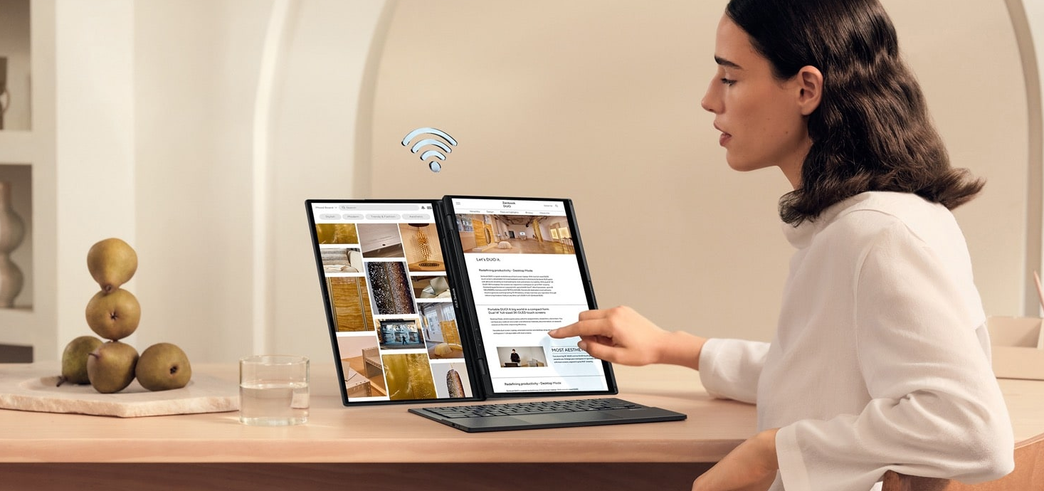 ASUS Zenbook DUO korzysta z najnowszego standardu Wi-Fi 7, który oferuje prędkości przesyłu danych do 4,8 razy wyższe niż w poprzedniej generacji. Technologia Multi-link Operation pozwala na jednoczesne łączenie się z wieloma pasmami, co przekłada się na stabilniejszy sygnał i niższe opóźnienia. Użytkownik może również podłączyć do trzech par słuchawek Bluetooth jednocześnie, co jest przydatne podczas wspólnego oglądania filmów lub prezentacji. System automatycznie wyszukuje najsilniejszy dostępny sygnał, zapewniając nieprzerwaną łączność z siecią w każdym miejscu.