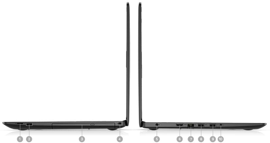 1. Czytnik kart microSD | 2. USB 2.0 | 3. Napęd optyczny | 4. Gniazdo blokady klinowej | 5. Gniazdo zasilania | 6. Port HDMI | 7. Port RJ45 GbE 10/100/1000 Mb/s | 8. Port USB 3.1 Type-A pierwszej generacji | 9. Port USB 3.1 Type-A pierwszej generacji | 10. Gniazdo słuchawek/mikrofonu