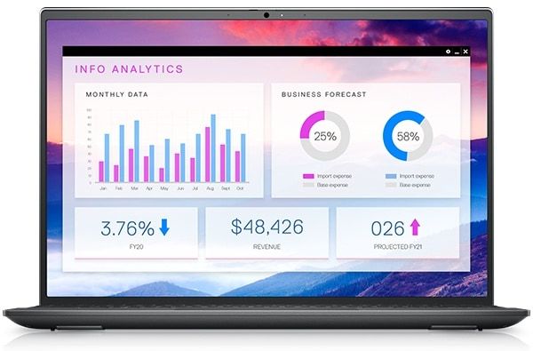 Zobacz jeszcze więcej na notebooku z wyświetlaczem 13,3" dzięki wąskiej obwódce z 4 stron, ekranowi o proporcjach 16:10 i o 4,6% wyższemu stosunkowi powierzchni ekranu do obudowy w porównaniu z poprzednią generacją. Efekt? Możesz całkowicie skupić się na pracy. Ekran z technologią Dell ComfortView Plus ma certyfikat TÜV Rheinland świadczący o niskiej emisji światła niebieskiego, które ma szkodliwy wpływ na wzrok. Technologia powstała z myślą o optymalnym komforcie dla oczu, nawet w przypadku wielogodzinnej pracy przed pilnym terminem. Jest to rozwiązanie sprzętowe, więc ilość niebieskiego światła jest mniejsza bez obniżania jakości kolorów.