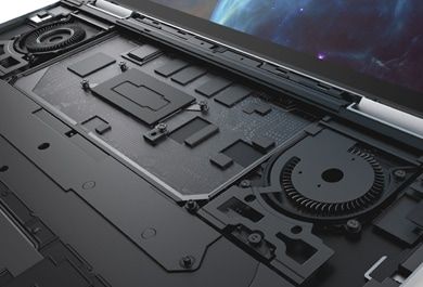 Zapoznaj się z nową, zmienioną konstrukcją chłodzenia notebooka XPS 13 „2 w 1”. Dwa odrębne wentylatory pokrywają większą powierzchnię, dwie wewnętrzne komory parowe i ukryte otwory odprowadzające ciepło zapewniają jeszcze większą wydajność pracy przy najcieńszej możliwej obudowie.