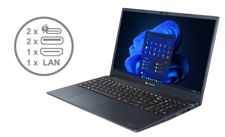 Dzięki dużemu wyborowi opcji podłączeń komputera Tecra A50 można zmienić dowolne miejsce we w pełni funkcjonalne biuro. Dwa ultraszybkie porty USB-C z obsługą technologii Thunderbolt 4 oznaczają proste dokowanie, umożliwiając ładowanie, przesyłanie danych i udostępnianie ekranu nawet czterem monitorom. Dodatkowe akcesoria można łatwo i szybko podłączać do innych pełnowymiarowych portów — w tym HDMI 2.0, LAN i dodatkowych portów USB-A 3.2. Aby zapewniać szybką i niezawodną łączność bezprzewodowe, urządzenie może się pochwalić technologią Intel® 802.11ax (WiFi 6) i oferuje opcjonalną łączność LTE, dzięki którym użytkownik zyskuje maksymalny komfort pracy w podróży.