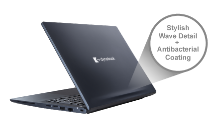 Nowocześni profesjonaliści nie mają się czego wstydzić, zabierając ze sobą laptopa Tecra A50. Wąskie ramki sprawiają, że urządzenie ma niewielkie wymiary, a mimo to jest wyposażone w dużą podświetlaną klawiaturę zapewniającą znakomity komfort pisania, sporą płytkę dotykową i pełną klawiaturę numeryczną. Przeciwodblaskowy ekran IPS o przekątnej 15,6” z opcjonalną obsługą dotyku można odchylać nawet o 180 stopni. Z kolei po zamknięciu klapy wrażenie robi stylowa pokrywa z charakterystycznymi detalami w postaci falistego wzoru i eleganckie wygrawerowane logo. Antybakteryjna powłoka w kolorze Mystic Blue to nie tylko stylowe wykończenie, ale też ochrona przed wirusami i bakteriami. Ponieważ laptop waży zaledwie 1,7 kg, można go bez trudu ze sobą zabierać.