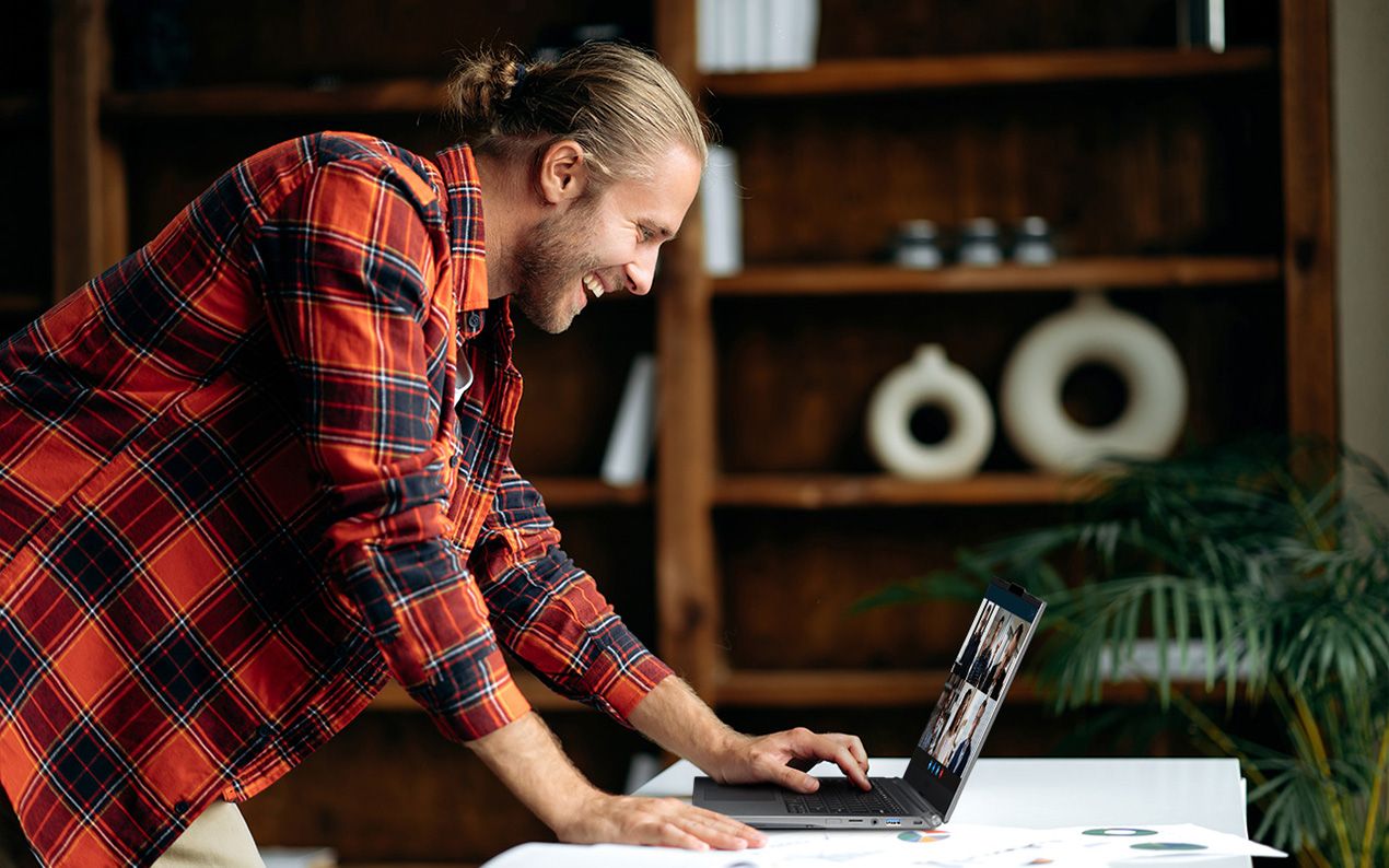 Nawiązywanie osobistych kontaktów nigdy nie było prostsze. Twój najlepszy uśmiech i ciepłe pozdrowienia są wyraźnie przekazywane przez obiektyw kamery HD wraz z dwoma głośnikami i podwójnym mikrofonem. Dzięki wbudowanej funkcji redukcji szumów wszystkie dźwięki otoczenia można odfiltrować, zapewniając krystalicznie czyste rozmowy. Wbudowana jest również technologia audio DTS:X® Ultra, która zapewnia bogate efekty dźwiękowe stereo, co pozwala w pełni skupić się na spotkaniach i wyróżnić się w prezentacjach.