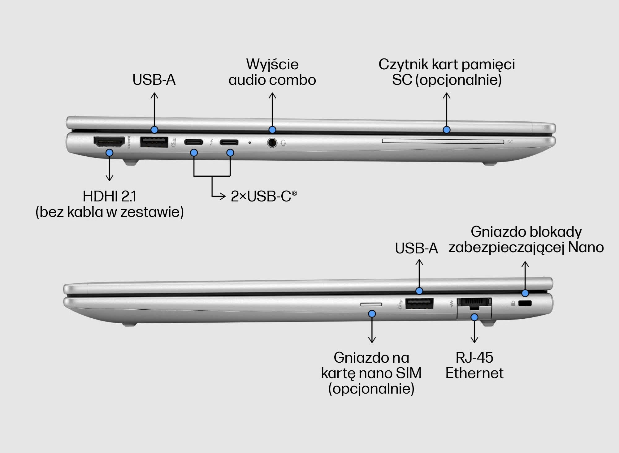 Zachowaj pełną elastyczność w każdym miejscu pracy. Oprócz szybkiej, bezprzewodowej łączności Wi-Fi 6e, masz do dyspozycji stabilne połączenie przewodowe dzięki portowi RJ-45 Ethernet. Bogaty zestaw złącz, w tym nowoczesne USB-C®, HDMI 2.1 oraz klasyczne USB-A, pozwala na bezproblemowe podłączenie wszystkich niezbędnych akcesoriów. Opcjonalne gniazdo na kartę nano SIM zapewnia dostęp do sieci komórkowej w podróży, a inteligentne zarządzanie energią za pomocą HP Power Manager pozwala w pełni kontrolować wydajność i stan baterii.
