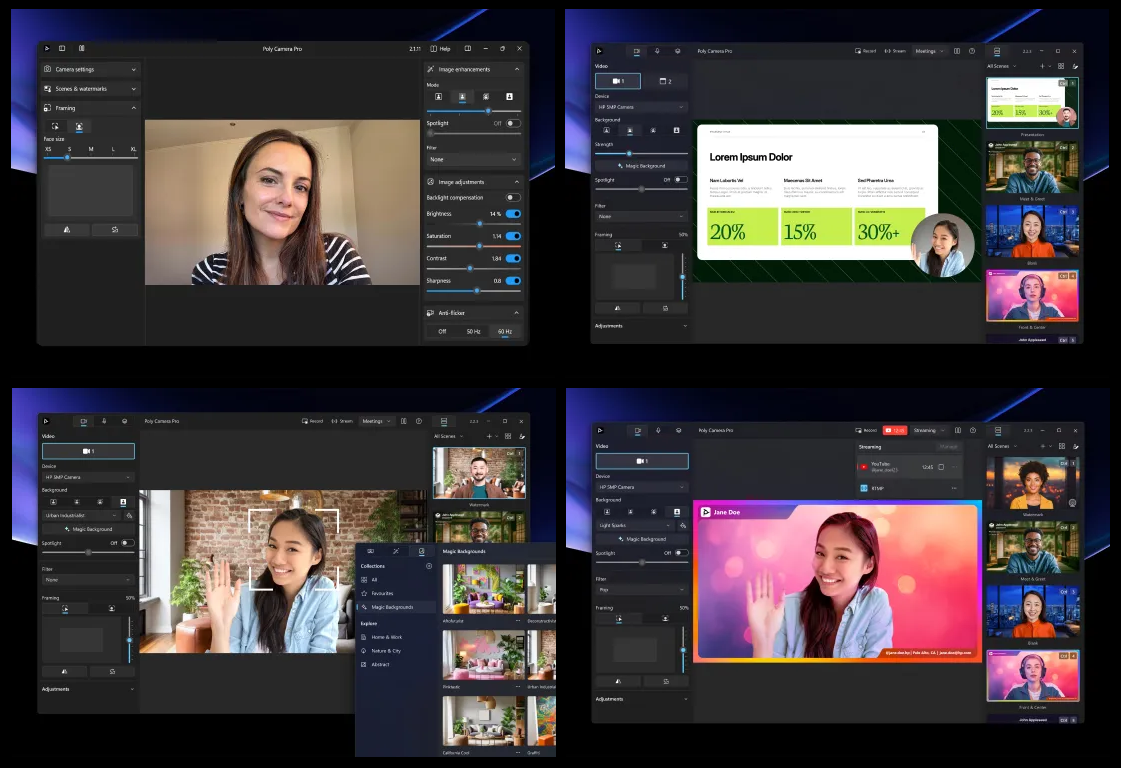 Prezentuj się doskonale na każdym spotkaniu dzięki zintegrowanemu pakietowi technologii Poly Audio i Poly Camera Pro.