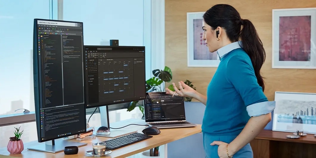 Wyglądaj i brzmij najlepiej podczas każdego spotkania. Zaprezentuj się krystalicznie czysto dzięki kamerze 5MP IR o wysokiej rozdzielczości, która gwarantuje ostrość w każdych warunkach oświetleniowych. Jednocześnie Poly Camera Pro, wspierane mocą obliczeniową NPU, działa jak Twój osobisty reżyser: funkcja Auto Frame utrzyma Cię w kadrze, nawet gdy się poruszasz, a inteligentna korekta zadba o naturalny kontakt wzrokowy. Możesz także profesjonalnie rozmyć tło, dodać firmowe znaki wodne lub filtry – wszystko to bezpośrednio we wszystkich aplikacjach konferencyjnych.