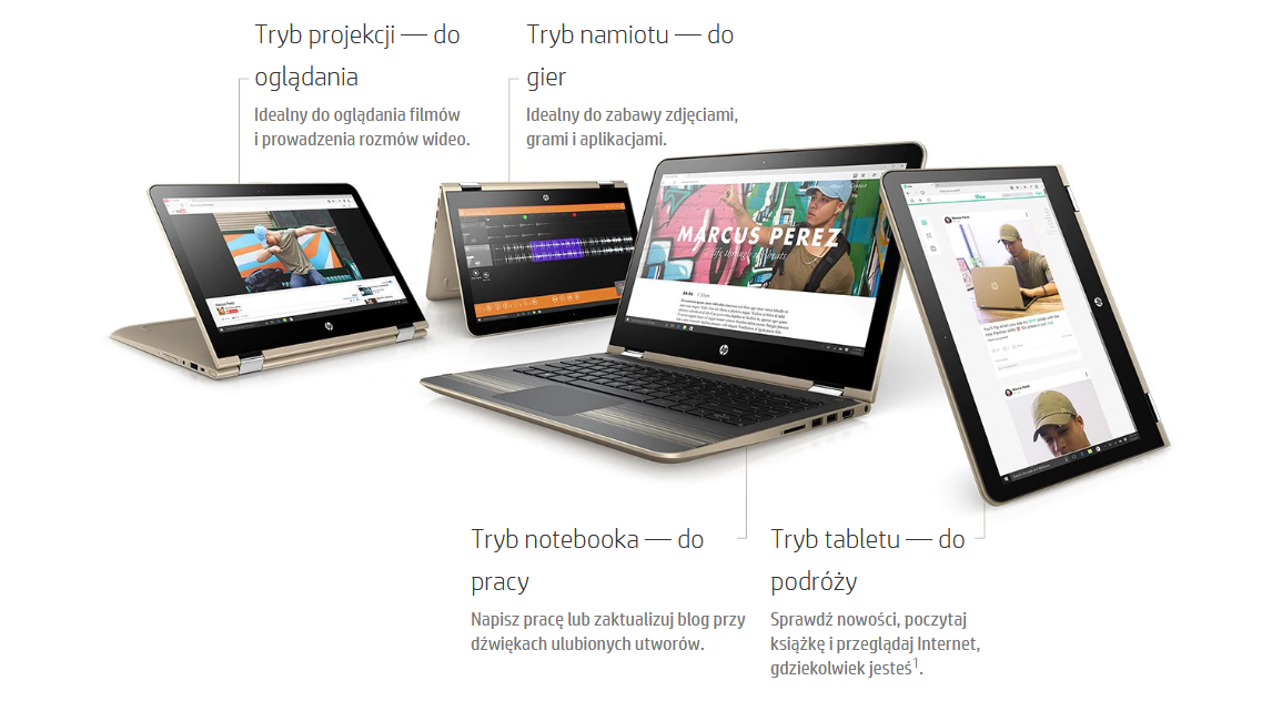 Dzięki zastosowaniu mniejszego zawiasu jest to obecnie nasz najsmuklejszy i najlżejszy komputer serii Pavilion x360. Jest o 14% cieńszy od poprzedniego modelu — ma niecałych 21mm grubości i waży mniej niż 1.4kg.