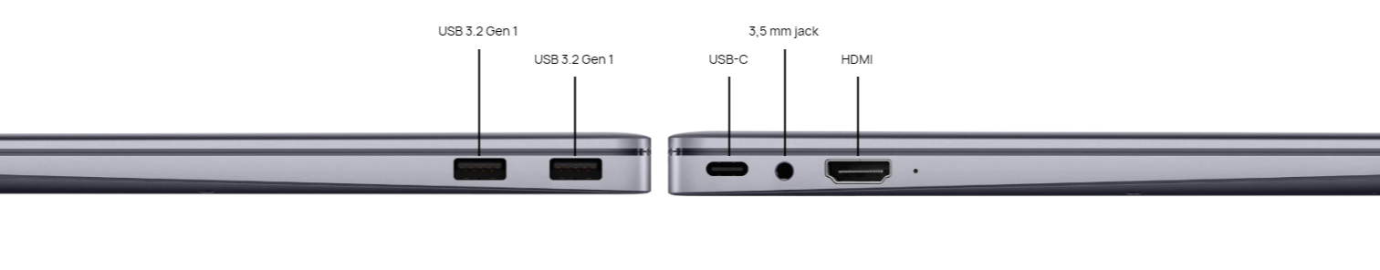 W smukłej konstrukcji HUAWEI MateBook 14 nie zabrakło licznych portów do podłączenia urządzeń zewnętrznych, takich jak słuchawki, zewnętrzny monitor czy dysk. Dzięki technologii ładowania zwrotnego możesz doładować swój telefon nawet wtedy, gdy Twój MateBook jest wyłączony.