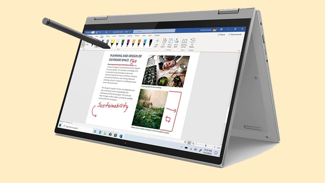 IdeaPad Flex 5 (14, Intel) rozkłada się w zakresie 360°, dlatego możesz z niego korzystać w różnych trybach odpowiednio do potrzeb. W uwiecznianiu inspiracji w drodze pomoże Ci opcjonalne pióro cyfrowe. A jeśli przyda Ci się pomoc, wystarczy się odezwać, a Alexa odpowie na Twoje pytania (w zależności od dostępności usługi).