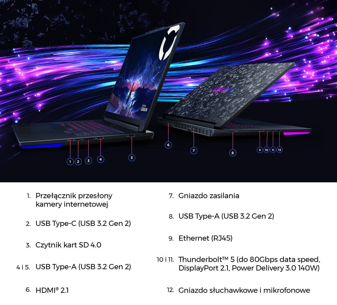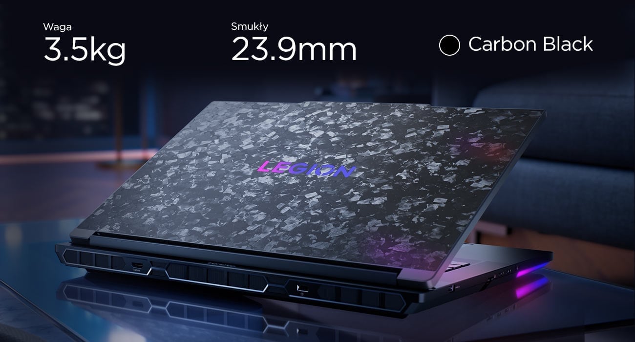 Legion 9i to przełomowy laptop z obudową wykonaną z ośmiowarstwowego włókna węglowego, łączącą lekkość z wyjątkową wytrzymałością. Każdy egzemplarz posiada unikalny wzór tłoczenia i jest pokryty w 90% z magnezu, spełniającego wojskowe normy wytrzymałości ‑ z myślą o trwałości. Dzięki profesjonalnemu zestawowi portów ‑ w tym Ethernet, czytnik kart SD i Thunderbolt 5 ‑ Legion 9i staje się pełnoprawnym zamiennikiem stacji roboczej. Ciesz się 16 milionami kombinacji kolorów dzięki pierścieniowi świetlnemu, listwie RGB i podświetlanemu logo Legion ‑ wszystko w pełni konfigurowalne w aplikacji Legion Space. Przycisk zasilania Legion „O” błyskawicznie informuje o aktywnym trybie pracy: Balance, Performance, Quiet lub Extreme. Kamera zintegrowana z AI Sync inteligentnie poprawia jakość obrazu, więc sprawdzi się idealnie do streamingu i komunikacji zespołowej podczas rozgrywki.