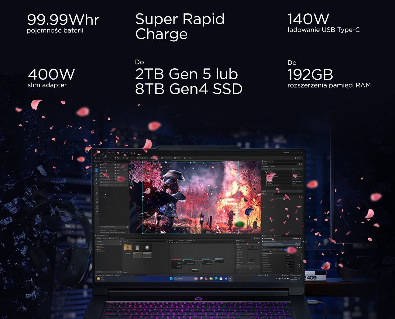 Przechowuj i uruchamiaj projekty gier oraz zasoby 3D błyskawicznie dzięki ultraszybkiemu dyskowi SSD ‑ do 2TB Gen 5 lub aż 8TB Gen 4 ‑ zapewniającemu płynne iteracje i niezakłóconą pracę. Największa bateria w laptopie gamingowym ‑ 99,99Whr ‑ pozwala kodować, kompilować i testować bez ograniczeń, gdziekolwiek jesteś. Dzięki zasilaczowi o mocy 400W i 140W ładowaniu USB‑C, masz pewność, że Twoje studio działa bez przeszkód zawsze i wszędzie.