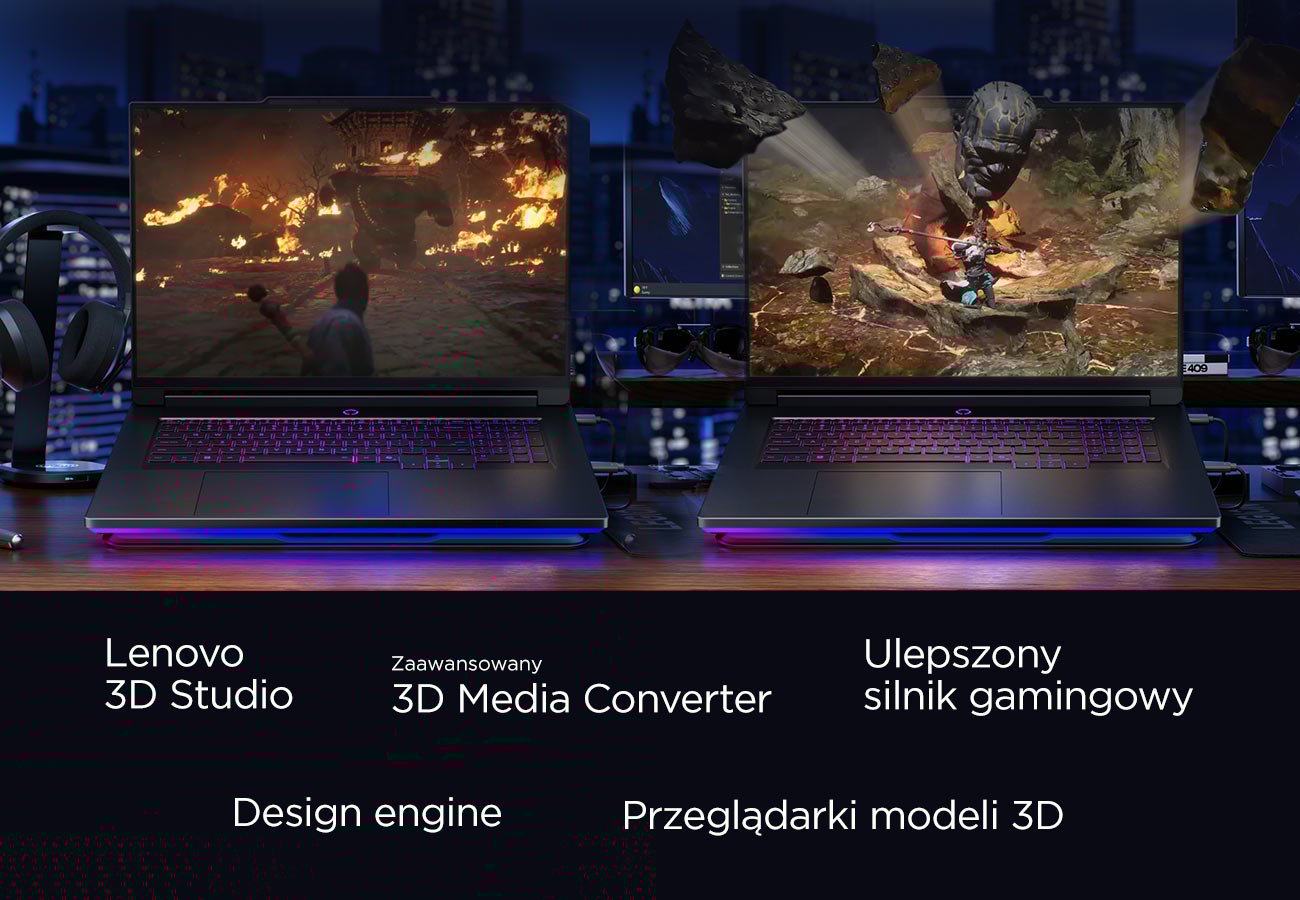 Stworzony z myślą o twórcach gier, artystach VFX i profesjonalistach 3D, którzy oczekują najwyższej wydajności, precyzji i możliwości rozbudowy. Lenovo Legion 9i to potężne studio zamknięte w formie laptopa ‑ gotowe do działania wszędzie tam, gdzie jesteś. Napędzany procesorami Intel® Core™ Ultra oraz kartą graficzną NVIDIA® GeForce RTX™, oferuje renderowanie w czasie rzeczywistym, procesy wspomagane sztuczną inteligencją oraz zaawansowany ray tracing. Zachwycający wyświetlacz Lenovo PureSight 4K umożliwia dynamiczne przełączanie między 4K przy 240Hz, a FHD przy 440Hz. Technologia chłodzenia Legion Coldfront: Vapor gwarantuje płynność działania nawet przy najbardziej wymagających projektach.