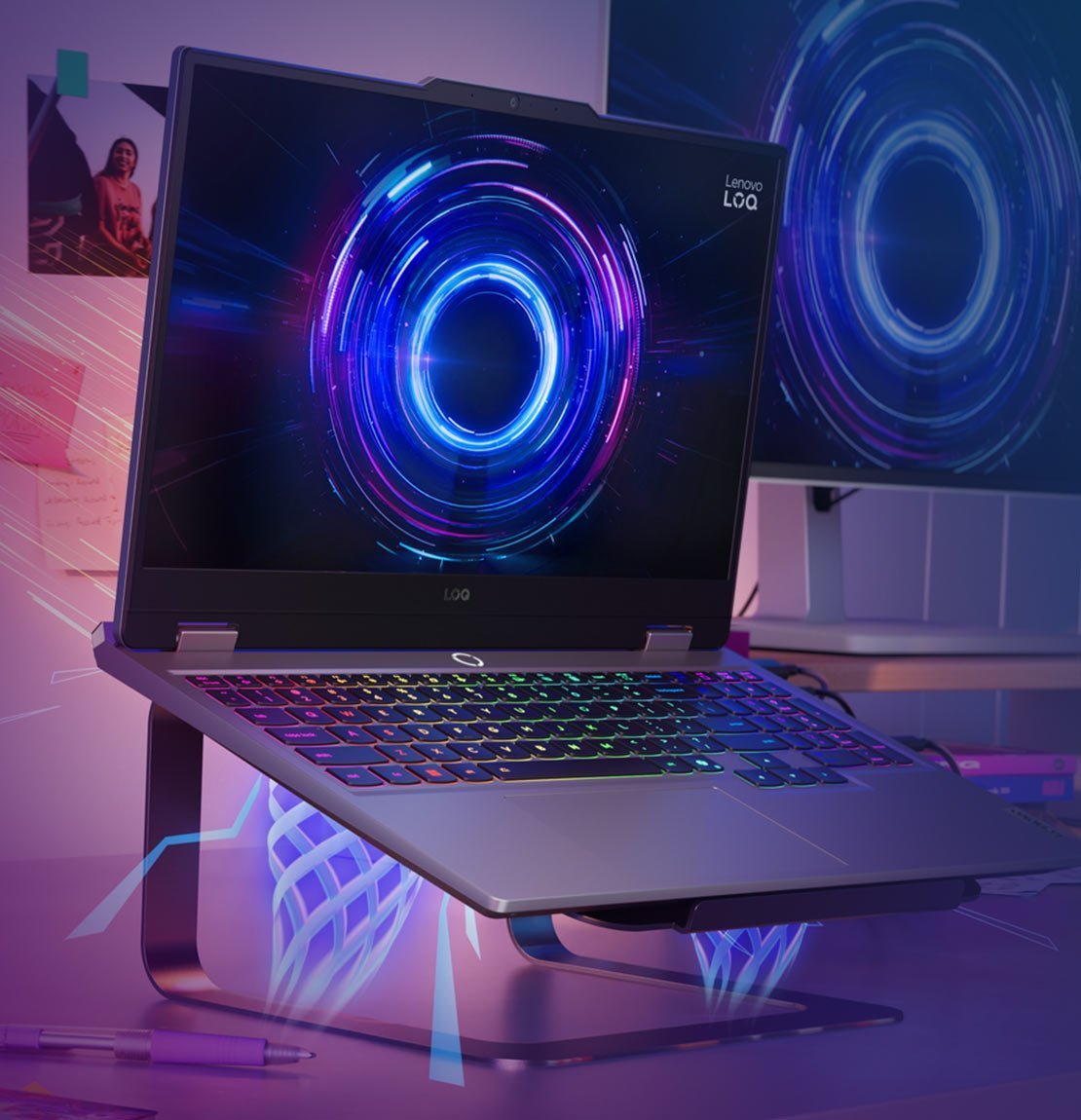 Technologia chłodzenia Hyperchamber Lenovo LOQ zapewnia cichą i chłodną pracę systemu dzięki turbodoładowanym wentylatorom, miedzianym heatpipe'om 3D i próżniowemu przepływowi powietrza, który kieruje ciepło z dala od użytkownika. Kombinacja klawiszy FN+Q pozwala na łatwe przełączanie między trybami pracy: Quiet, Balance, Performance lub Extreme, dostosowując się do aktualnie wykonywanych zadań. Lenovo AI Engine+ optymalizuje pracę wentylatorów zapewniając stabilne chłodzenie nawet podczas dużego obciążenia. Turbodoładowane wentylatory wraz z niezawodnymi miedzianymi ciepłowodami i radiatorami sprawiają, że laptop jest chłodny w dotyku, dzięki czemu idealnie nadaje się do długich sesji nauki lub gier ze znajomymi. Przejdź do prawdziwej rozgrywki.