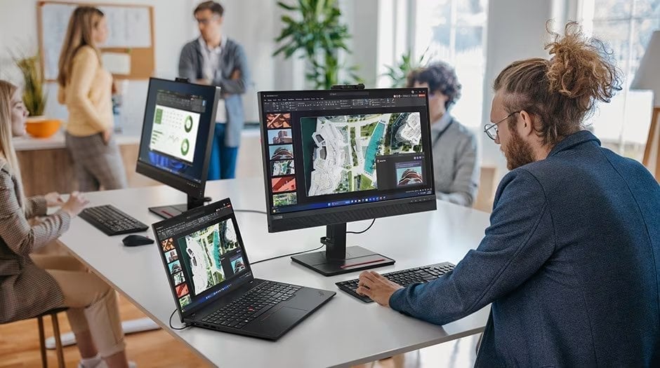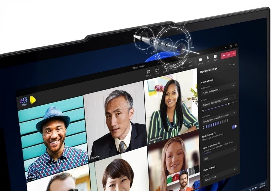 Prezentuj się doskonale podczas każdego spotkania online. Kamera o wysokiej rozdzielczości 5 MP (dostępna w wariancie RGB lub na podczerwień) w połączeniu z oprogramowaniem Lenovo View, opartym na AI, dba o jakość obrazu – automatycznie kadruje postać, poprawia oświetlenie i pozwala rozmyć tło. Równie czysty jest dźwięk, dzięki mikrofonom z redukcją szumów i systemowi głośników z technologią Dolby Atmos®, które zapewniają bogate i wyraźne brzmienie.