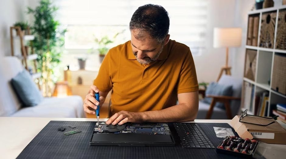 Zyskaj kontrolę dzięki łatwym, samodzielnym naprawom. Laptop ThinkPad T14 Gen 6 został zaprojektowany z myślą o prostej konserwacji i wydłużonym cyklu życia. Posiada liczne części wymienne przez użytkownika (CRU), do których dołączyła teraz bateria o pojemności 57 Wh. Możliwość samodzielnej wymiany komponentów i modernizacji zapewnia bezproblemowe użytkowanie przez lata.