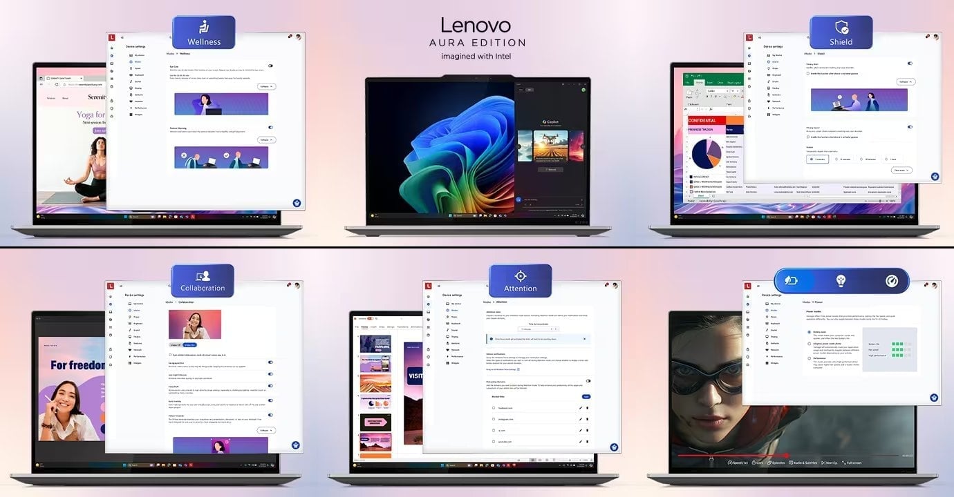 Oprogramowanie Lenovo Aura Edition, opracowane we współpracy z firmą Intel®, to zbiór inteligentnych funkcji opartych na sztucznej inteligencji, które podnoszą komfort codziennej pracy. Najlepsze urządzenia i najlepsze doświadczenia – oto efekt naszej wieloletniej, ścisłej współpracy.
